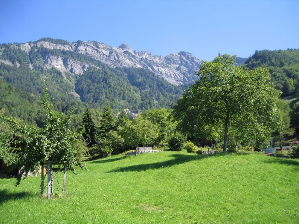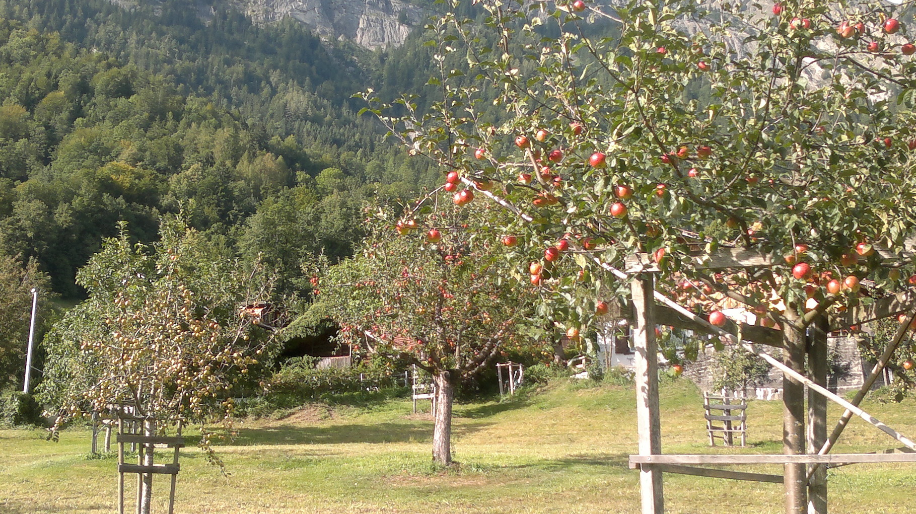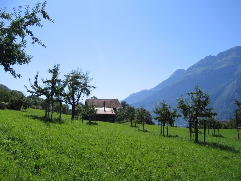 Auf dieser 0.7 ha grossen Fläche in Brienz stehen rund 50 Hochstamm-Obstbäume, so wie es früher in den traditionellen „Hostetten" um jeden Hof üblich war. Von den ganz alten Bäumen mussten viele gefällt werden, doch wurden stets wieder neue gepflanzt. Dabei wurden nicht nur die verschiedensten Arten - Äpfel, Birnen, Zwetschgen, Pflaumen, Baumnüsse, Mispel (Wildobst) etc. - sondern auch verschiedene alte Sorten wie z.B. der Usterapfel gewählt, die sonst langsam zu verschwinden drohen. Mit Nisthilfen werden auch die Bestäuber - wie Wildbienen und Hummeln - sowie Vögel als Schädlingsbekämpfer unterstützt.