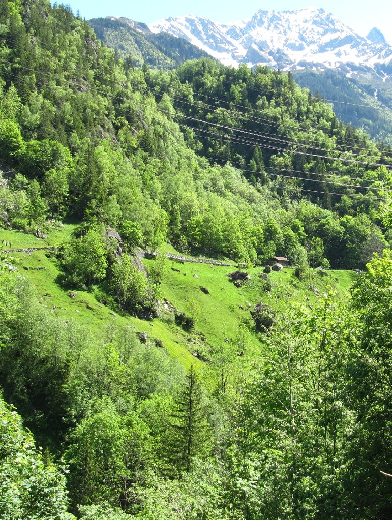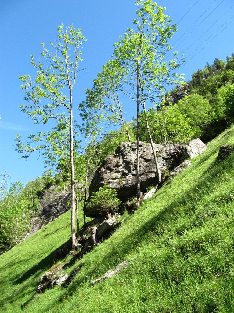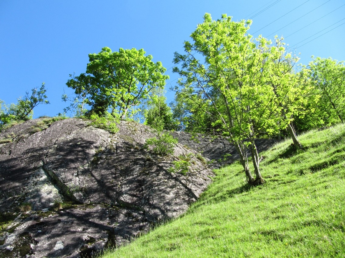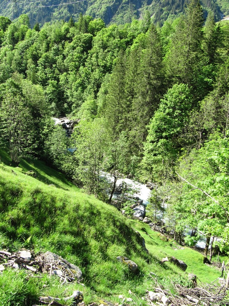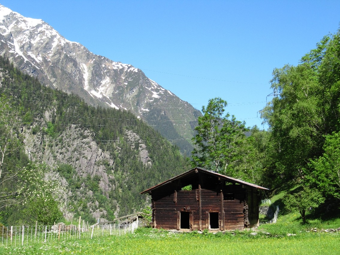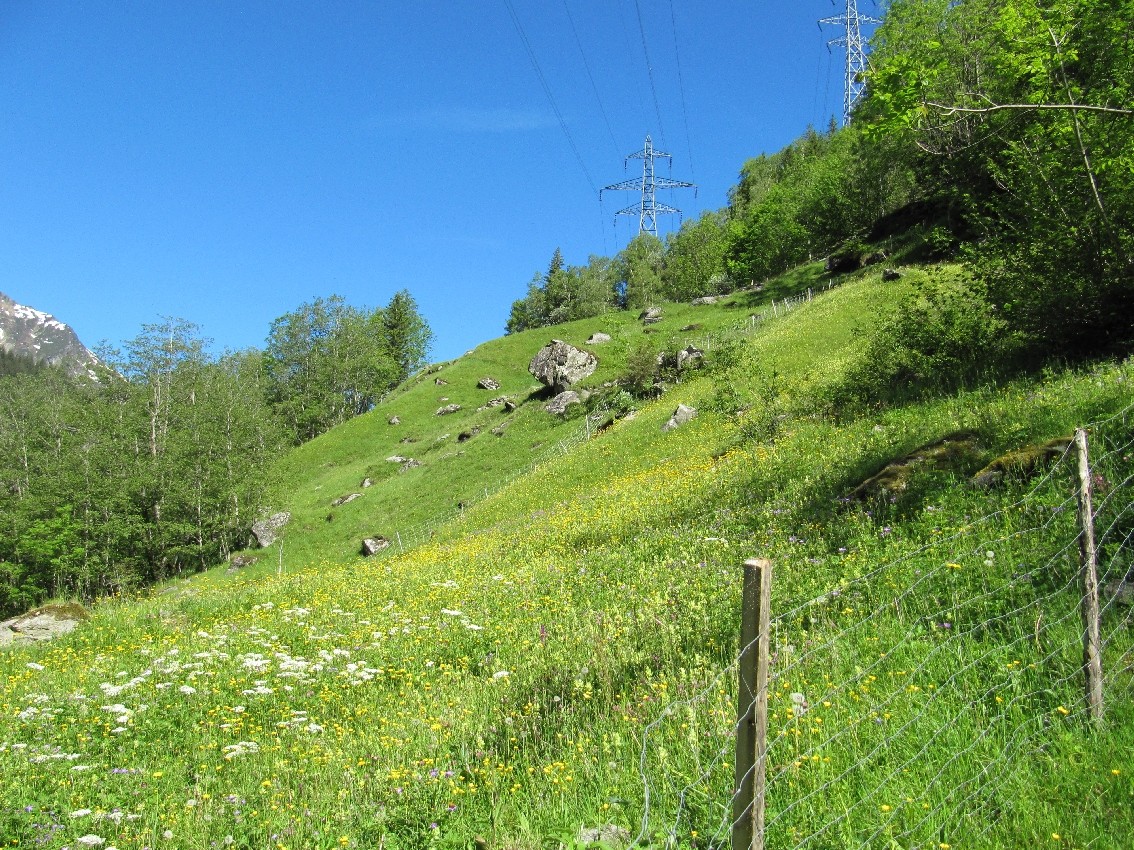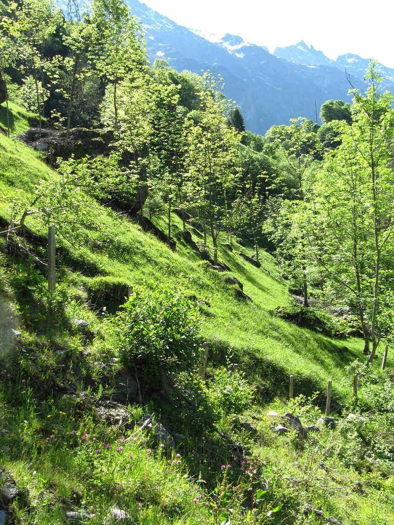 In Guttannen auf 1'000 m liegen rund 2.3 ha ökologische Weiden und Wiesen von hoher ökologischer Qualität, die steil bis an die Aare reichen. Mähen und Ausholzen gestaltet sich hier besonders schwierig, da alles nach oben transportiert werden muss und unzählige Felsböcke, Steine und Gehölz die Fläche durchziehen. So wird das meiste nun mit Schafen beweidet, nur ein kleiner, flacherer Teil mit vielen Orchideen wird noch gemäht. Auch wurden je drei Eichen und Speierlinge gepflanzt.