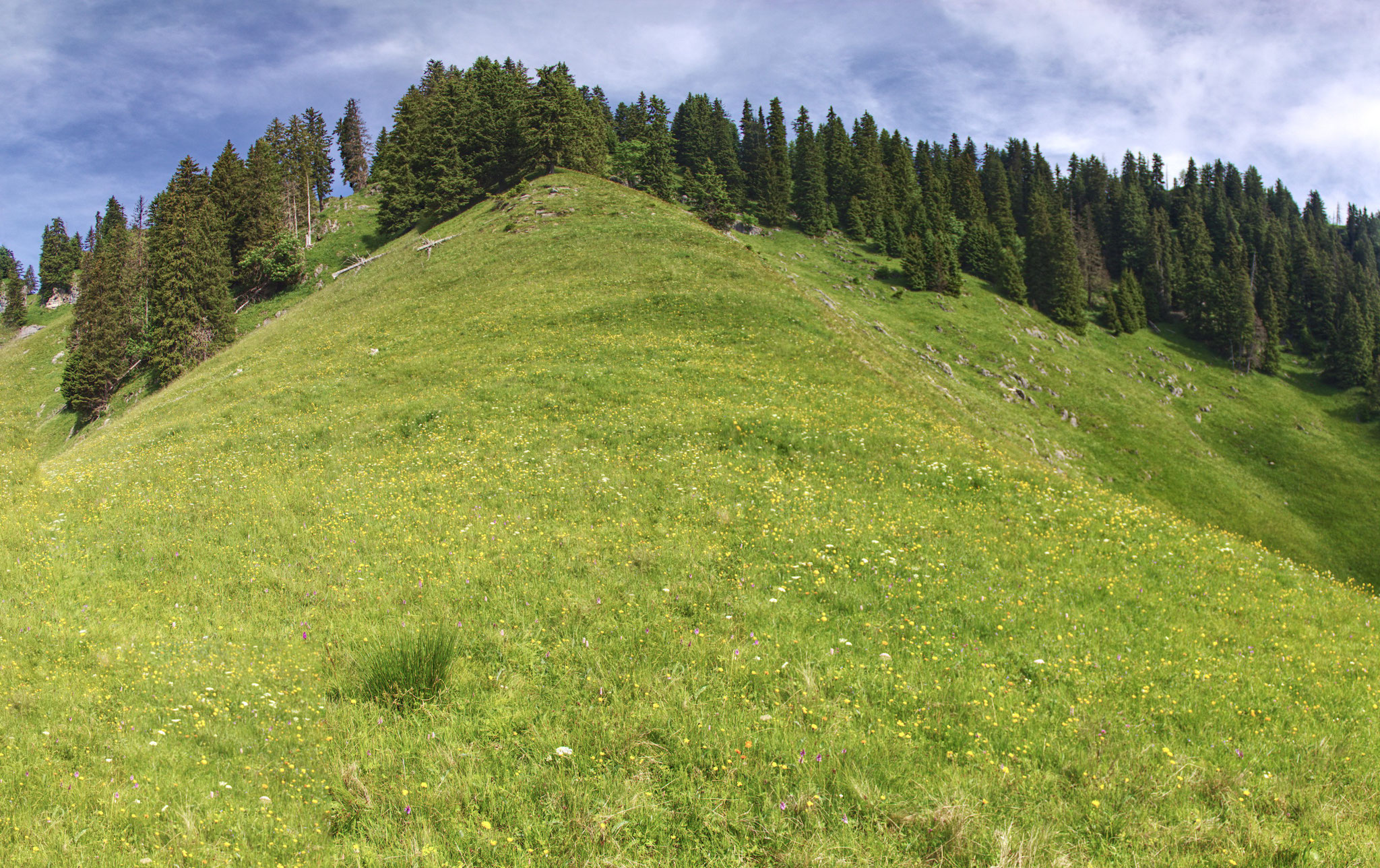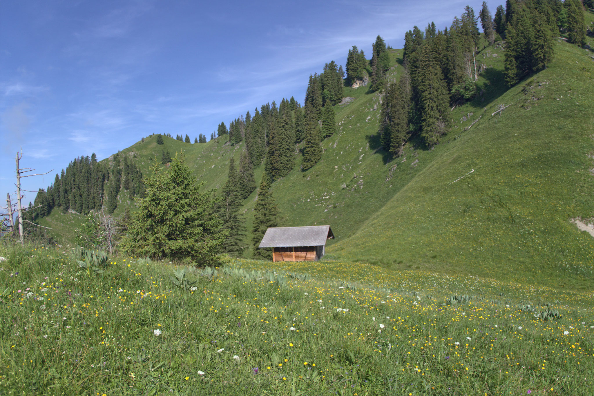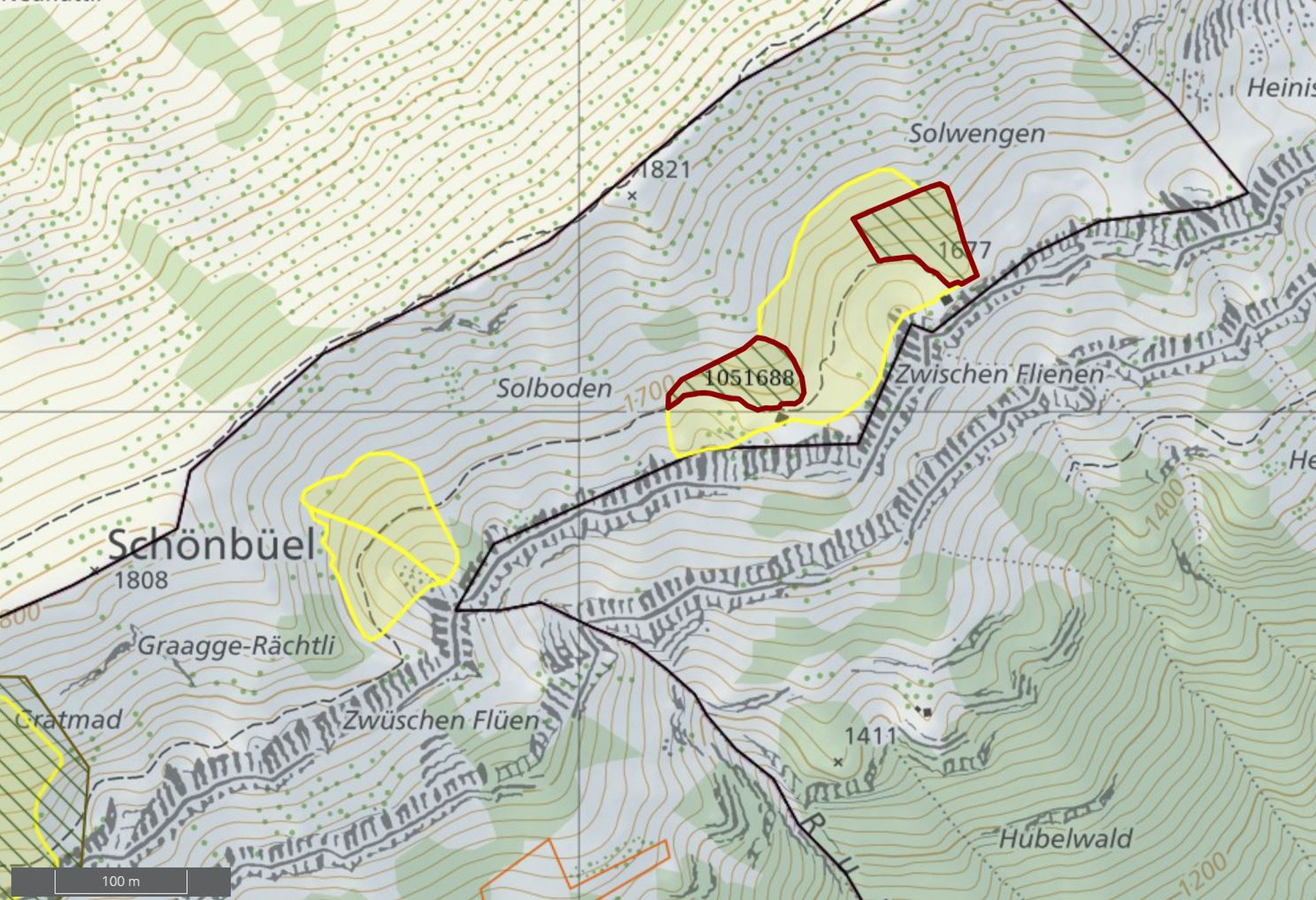 Das Gebiet Solboden-Solwengen liegt auf 1700 m Höhe hoch über dem Brienzersee direkt unterhalb des Hardergrats im nordöstlichsten Zipfel der Gemeinde Ringgenberg, im Wildschutz- und Jagdbanngebiet Augstmatthorn. Die Artenvielfalt der 0.7 ha grossen Mähwiese ist ausgesprochen hoch – sie gehört zum kantonalen Inventar der Trockenwiesen- und weiden. Deshalb wurde die vor längerer Zeit aufgegebene Bewirtschaftung auf Initiative des zuständigen Naturschutzaufsehers vor vier Jahren wieder aufgenommen. So fällt die Fläche nicht dem Wald anheim und die Artenvielfalt bleibt erhalten. Weil die Fläche so steil und abgelegen ist, muss das Heu per Helikopter abtransportiert werden – ein Kompromiss zugunsten der Biodiversität und bestes Futter für die Yaks des Bewirtschafters. Das Wort «Sol» bedeutet «sumpfige Stelle» und tatsächlich gibt es solche, was das Artenspektrum noch einmal verbreitert. Neben Orchideen wie Knabenkraut, Weisse Höswurz oder Brandorchis flattern auch ungemein viele Schmetterlinge über die Fläche. Ein kleines Hüttli bietet den Bewirtschaftenden Unterschlupf.