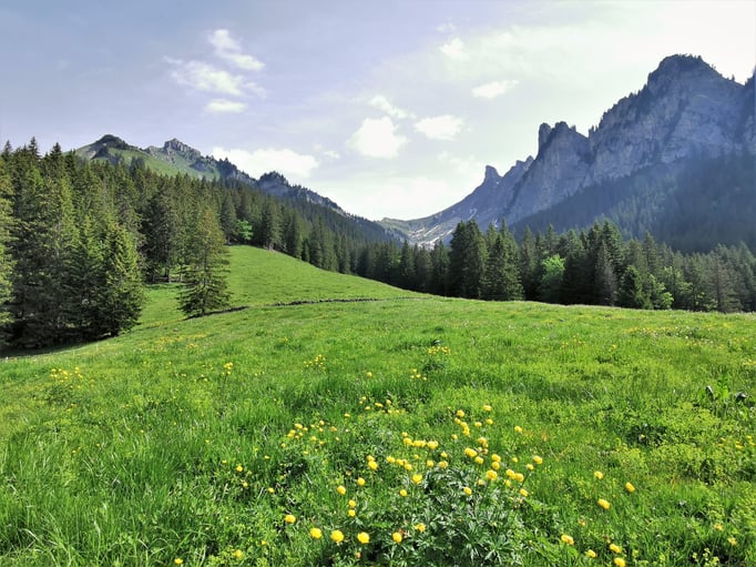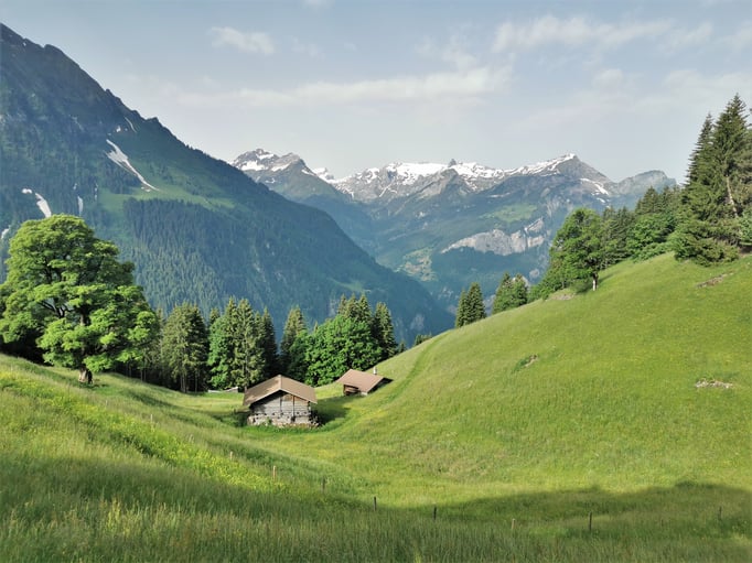 Am Ende des Walds tritt man auf die weitläufigen Weiden des untersten Stafels der Alp Usser Iselten. Hier öffnet sich die Sicht gegen das Lauterbrunnental hin. Weiter oben ist die Bahnstation Schynige Platte zu erkennen, am nördlichen Horizont stossen die spitzen Felszacken der Faulhornkette in den Himmel.