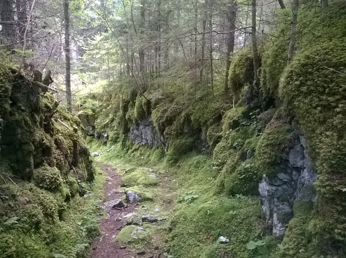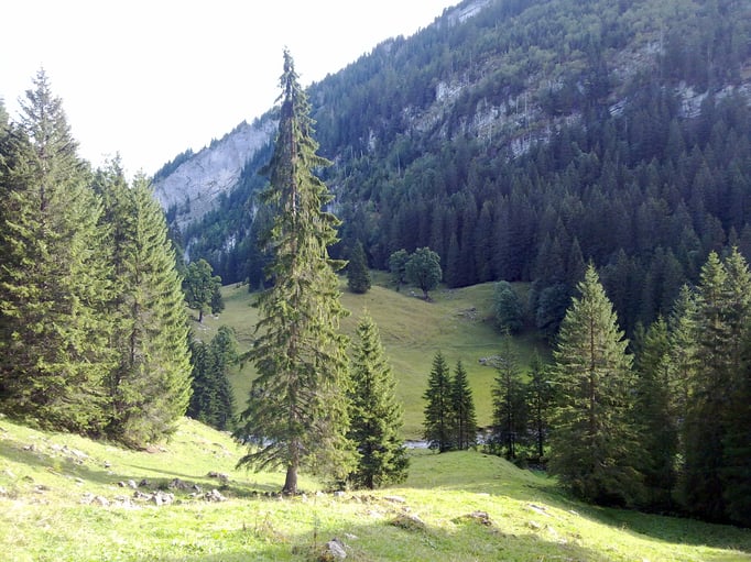 Am hinteren Ende des Tälchens steigt der Weg steil an, um die nächste Geländestufe zu überwinden. Und erneut erlebt man beim Verlassen des Waldes eine Überraschung: Das Gelände weitet sich zu einem grossen, grünen Kessel, der fast ringsum von felsigen Abhängen umgeben ist. Die Alp Botchen ist ein kleines, stilles Paradies. 2014 wurde sie mit dem Kulturlandschaftspreis der Region Oberland-Ost ausgezeichnet. Zur Gewinnerfläche Alp Botchen>>> Mächtige Bergahorne stehen locker verstreut auf den Alpwiesen, dazwischen plätschert der Giessbach. Die Gegend wirkt wie ein Park – und liegt dennoch mitten in urwüchsiger Gebirgslandschaft.